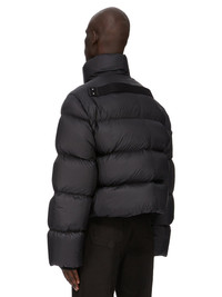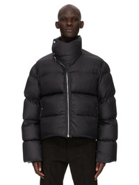 RICK OWENS FW25 CONCORDIANS TURTLE JKT IN BLACK LIGHT NYLON THIS TURTLE JKT IS CROPPED BELOW THE WAIST WITH A CENTRE FRONT ZIPPER AND HIGH TUBE-NECK COLLAR WITH BIAS ZIPPER AND SNAPS. IT IS PADDED AND QUILTED WITH HORIZONTAL STITCHING LINES AND HAS SIDE FRONT WELT POCKETS WITH SNAPS. IT FEATURES A SIGNATURE COTTON WEBBING STRAP, WITH RIVET DETAIL, ACROSS THE BACK YOKE. IT HAS TWO INSIDE ZIPPERED POCKETS THIS AIRY AND LIGHTWEIGHT NYLON IS MADE USING GRS CERTIFIED RECYCLED NYLON WHICH ENSURES A REDUCTION IN WATER CONSUMPTION, EMISSIONS AND HAZARDOUS WASTE, LESSENING THE DEPENDENCE ON NON-RENEWABLE RESOURCES COLOR: BLACK MATERIAL: 100% NYLON KNIT RIB CUFF 100% NEW WOOL INSIDE POCKETS 97% COTTON + 3% ELASTANE PADDING 90% GOOSE DOWN + 10% MALLARD FEATHERS MODEL IS 189CM TALL MODEL WEARS SIZE 48