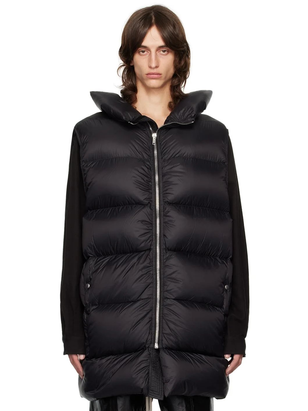 Down-filled quilted nylon satin vest. · Funnel neck · Zip closure · Seam pockets · Zip pockets at interior · Full nylon satin lining Supplier color: Black Fill: 90% goose down, 10% mallard feathers. Body: 100% polyamide. Trim: 97% cotton, 3% elastane. Made in Italy 242232M178002
