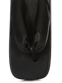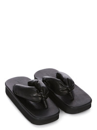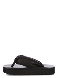 RICK OWENS SS26 TEMPLE FLIP FLOPS IN BLACK WASHED LAMB THESE FLIP FLOPS ARE AN OPEN, SLIP ON, SANDAL WITH A SLIGHTLY PADDED LEATHER STRAP THAT SECURES WITH A LEATHER THONG BETWEEN THE TOES. IT HAS A THICK PLATFORM WITH A SHARK-TOOTHED SOLE. THIS MEDIUMWEIGHT LAMB LEATHER HAS A NATURAL GRAIN TEXTURE AND A WAXY HANDFEEL. TANNED IN THE NAPLES AREA OF ITALY, THIS LEATHER IS TUMBLED MULTIPLE TIMES IN A LARGE DRUM IN ORDER TO BRING OUT THE NATURAL GRAIN TEXTURE OF THE SKIN. THE LEATHER IS FINISHED WITH NATURAL WAXES IN ORDER TO ACHIEVE THE NATURAL AND WAXY HANDFEEL. BECAUSE THIS SKIN IS NAKED, NOT FINISHED USING ANY PIGMENTS COVERING THE SKIN, NATURAL MARKINGS AND SHADINGS ARE VISIBLE WHICH MAKES EACH SKIN AND PRODUCT UNIQUE. VEG TANNING MEANS ONLY VEGETAL AND NATURAL TANNINS WERE USED IN THE PROCESS OF TANNING AND PRESERVING THIS LEATHER. THIS TANNERY IS LWG CERTIFIED WITH A GOLD RATING. COLOR: BLACK MATERIAL:UPPER 100% RAM LEATHER PADDING 100% POLYESTER PLANTAR FACING 100% RAM LEATHER SOLE 100% E.V.A