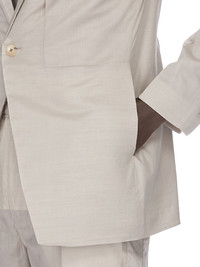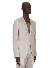 RICK OWENS SS26 TEMPLE FOGPOCKET SOFT SOFT BLAZER IN PEARL COTTON VOILE THIS FOGPOCKET SOFT SOFT BLAZER IS BELOW HIP LENGTH WITH LONG SLEEVES AND A CLASSIC SOFT SHOULDER PAD. IT HAS A SLIM LAPEL WITH SINGLE BUTTON FRONT CLOSURE, TWO FOG BREAST POCKETS WITH A VERTICAL OPENING AND INTERNAL SNAP AND TWO SIDE SEAM POCKETS. IT HAS TWO SIDE BACK VENTS AND FIVE-BUTTON CUFFS. IT IS FULLY LINED WITH TWO INTERNAL BUTTONED POCKETS. THIS LIGHTWEIGHT AND SEMITRANSPARENT COTTON VOILE HAS A SOFT HANDFEEL. THIS FABRIC IS MADE USING GOTS CERTIFIED ORGANIC COTTON WHICH MEANS THE NATURAL FIBRE IS GROWN WITHOUT HARMFUL CHEMICALS, LEAVING OUR SOIL, AIR AND WATER CLEANER FROM CONTAMINATES. COLOR: PEARL MATERIAL:100% COTTON YOKE AND SLEEVES LINING 100% CUPRO BUTTONS 100% BUFFALO HORN MODEL IS 189CM TALL MODEL WEARS SIZE 48