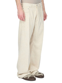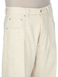 RICK OWENS FW25 CONCORDIANS GETH JEANS IN NATURAL LINEN CORDUROY THESE GETH JEANS ARE A FULL LENGTH 5 POCKET JEAN WITH A LOW-RISE AND WIDE FIT. THEY HAVE A SILVER BUTTON FLY, BELT LOOPS AND POCKET RIVETS THIS MEDIUMWEIGHT COTTON AND LINEN BLEND CORDUROY HAS A SOFT HANDFEEL THE COLOR OF THIS CORDUROY IS NATURAL WITH SLUBS AND IMPURITIES VISIBLE AS A PART OF THE COLORATION THIS FABRIC IS MADE USING GOTS CERTIFIED ORGANIC COTTON WHICH MEANS THE NATURAL FIBER IS GROWN WITHOUT HARMFUL CHEMICALS, LEAVING OUR SOIL, AIR AND WATER CLEANER FROM CONTAMINATES COLOR: NATURAL MATERIAL: 74% COTTON + 26% LINEN MODEL IS 189CM TALL MODEL WEARS SIZE 31