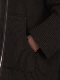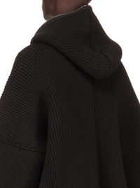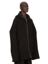 RICK OWENS FW24 PORTERVILLE RUNWAY GIMP HOODIE IN BLACK MEGA WOOL KNIT THIS GIMP HOODIE IS MID-THIGH LENGTH WITH AN OVERSIZED FIT. IT HAS LONG SLEEVES WITH LOW SHOULDERS AND A DROPPED ARMHOLE, A LARGE HOOD AND TWO FRONT PATCH POCKETS. IT FEATURES A FRONT ZIPPER CLOSURE THAT RUNS FROM THE HEM ALL THE WAY UP THROUGH THE HOOD, ALLOWING IT TO BE ZIPPED COMPLETELY CLOSED OVER THE FACE THIS ULTRA HEAVY WEIGHT WOOL KNIT IS COMPACT WITH A SOFT HANDFEEL - COLOR: BLACK - MATERIAL: 100% NEW WOOL - MODEL IS 189CM TALL - ITEM IS AVAILABLE IN ONE SIZE