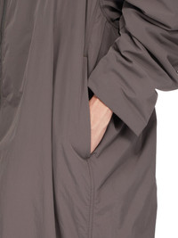 RICK OWENS FW25 CONCORDIANS RUNWAY GIMP MAC BIG SHOULDERS IN DARKDUST MATTE NYLON THIS GIMP MAC BIG SHOULDERS IS BELOW KNEE LENGTH WITH LONG LOOSE SLEEVES AND WIDE SHOULDERS. IT HAS A LARGE HOOD, LEVEL SHOULDER SEAMS AND CONCEALED SIDE SEAM POCKETS. IT FEATURES A FRONT ZIPPER CLOSURE THAT RUNS FROM BELOW HIP LENGTH, UP ALL THE WAY UP THROUGH THE HOOD, ALLOWING IT TO BE ZIPPED COMPLETELY CLOSED OVER THE FACE. IT HAS A COTTON WEBBING STRAP WITH RIVET DETAIL ON THE BACK YOKE. IT IS FULLY LINED AND HAS TWO INTERNAL ZIPPERED POCKETS THIS LIGHTWEIGHT NYLON HAS A BRUSHED, PEACHY FINISH AND A DRY HANDFEEL. IT IS WATER REPELLENT COLOR: DARKDUST MATERIAL: 100% NYLON SLEEVES LINING 100% CUPRO POCKETS LINING 100% COTTON MODEL IS 189CM TALL MODEL WEARS SIZE 48