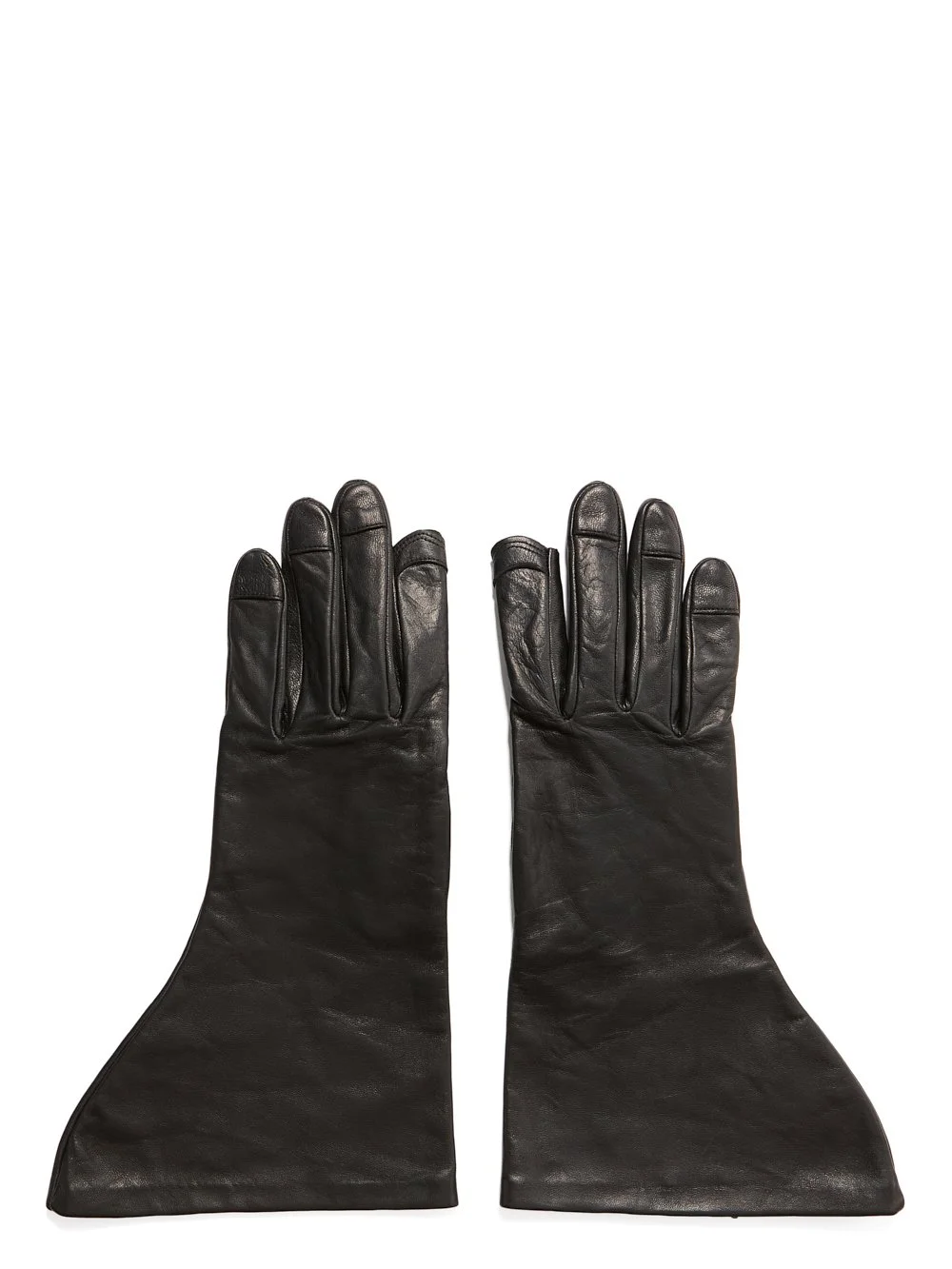 RICK OWENS FW25 CONCORDIANS RUNWAY GLEAM GLOVES IN BLACK VEG NAPPA LAMB THESE GLEAM GLOVES ARE ABOVE WRIST LENGTH. THEY FIT CLOSELY AROUND THE HAND WIDEN AT THE TOP OUTER SIDE. THEY HAVE CUT-OUTS ON THUMB AND INDEX FINGER THIS MEDIUMWEIGHT LAMB LEATHER IS VEG TANNED AND FINISHED USING NATURAL WAXES AND ANILINE WHICH MAKES A SUPPLE HANDFEEL. BECAUSE THIS SKIN IS NAKED, NOT FINISHED USING ANY PIGMENTS COVERING THE SKIN, NATURAL MARKINGS AND SHADINGS ARE VISIBLE WHICH MAKES EACH SKIN AND PRODUCT UNIQUE VEG TANNING MEANS ONLY VEGETAL AND NATURAL TANNINS WERE USED IN THE PROCESS OF TANNING AND PRESERVING THIS LEATHER COLOR: BLACK MATERIAL: 100% LAMB LEATHER LINING 100% SILK