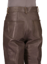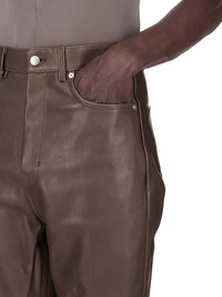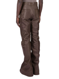 RICK OWENS FW25 CONCORDIANS RUNWAY BOLANS IN DRKDUST WASHED CALF LEATHER THESE BOLANS ARE A HIGH WAISTED, SLIM FIT 6-POCKET JEAN WITH A FLOOR-LENGTH BOOT CUT. THEY CLOSE WITH A WAIST BUTTON AND CONCEALED BUTTON FLY. THEY HAVE A WAISTBAND WITH BELT LOOPS AND POCKET RIVETS AND BACK PATCH POCKETS WITH TOPSTITCHING THIS HEAVYWEIGHT COW LEATHER IS VEG TANNED AND FINISHED USING NATURAL WAXES. A FINAL WASH GIVES THIS LEATHER ITS SOFTNESS AND BRINGS OUT THE NATURAL GRAIN TEXTURE OF EACH SKIN. BECAUSE THIS SKIN IS NAKED, NOT FINISHED USING ANY PIGMENTS COVERING THE SKIN, NATURAL MARKINGS AND SHADINGS ARE VISIBLE WHICH MAKES EACH SKIN AND PRODUCT UNIQUE VEG TANNING MEANS ONLY VEGETAL AND NATURAL TANNINS WERE USED IN THE PROCESS OF TANNING AND PRESERVING THIS LEATHER THIS TANNERY IS LWG CERTIFIED WITH A SILVER RATING COLOR: DRKDUST MATERIAL: 100% CALF LEATHER INSIDE BAND AND POCKETS INTERNAL DETAIL 100% LAMB LEATHER LINING 100% COTTON MODEL IS 189CM TALL MODEL WEARS SIZE 31