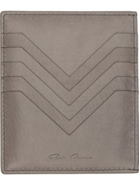 Buffed calfskin card holder. · Burnished edges throughout · Logo embossed at face · Six card slots and one note slot · Lambskin lining · H4.5" x W3.75" Supplier color: Dust Body: 100% calfskin. Lining: 100% lambskin. Made in Italy 252232M163002
