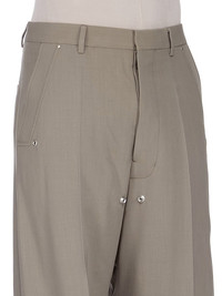 RICK OWENS SS25 HOLLYWOOD TAILORED BELAS IN MOUTWASH HEAVY COTTON POPLIN THESE TAILORED BELAS ARE FULL-LENGTH WITH A LOW CROTCH AND WIDE LEG. THEY FEATURE A WAISTBAND WITH BELT LOOPS, RIVETS AND A CONCEALED BUTTON FLY WITH TWO SNAPS AT BOTTOM. THEY HAVE SIDE WELT POCKETS WITH RIVET AND EYELET DETAIL AND TWO REAR WELT POCKETS WITH SNAPS AND TOPSTITCHING THIS MEDIUMWEIGHT COTTON POPLIN HAS A CRISP HANDFEEL AND WASHED FINISH THIS FABRIC IS MADE USING GOTS CERTIFIED ORGANIC COTTON WHICH MEANS THE NATURAL FIBER IS GROWN WITHOUT HARMFUL CHEMICALS, LEAVING OUR SOIL, AIR AND WATER CLEANER FROM CONTAMINATES COLOR: MOUTHWASH MATERIAL: 97% COTTON + 3% ELASTANE MODEL IS 189CM TALL MODEL WEARS SIZE 48