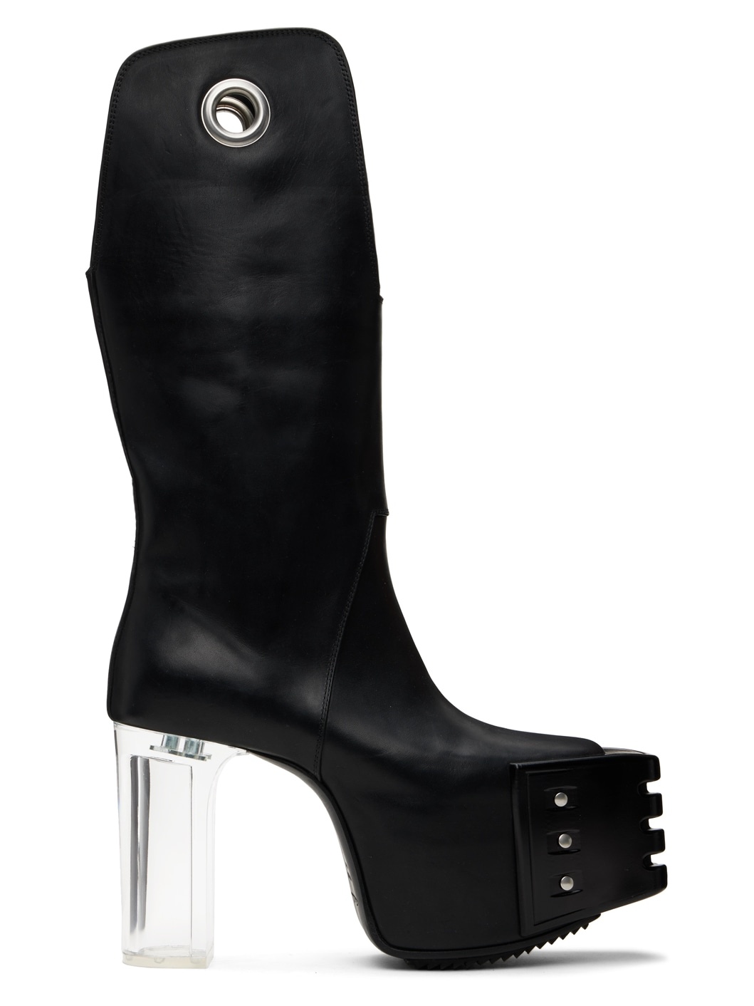 Knee-high LWG-certified vegetable-tanned groppone leather slip-on boots in black. · Studded plaque at square toe · Slit at front and back collar · Eyelets vent at sides · Transparent plexiglass block heel · Covered platform midsole · Leather sole with treaded TPU injection · Platform: H4" · Heel: H4.75" Supplier color: Black/Clear