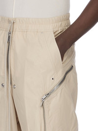 RICK OWENS SS26 TEMPLE HEIZER BELAS IN SAND COTTON POPLIN THESE HEIZER BELAS ARE FULL LENGTH WITH A LOOSE FIT AND A DROPPED CROTCH. THEY HAVE AN ELASTICIZED WAISTBAND WITH DRAWSTRING, A BELA FLY WITH EXPOSED CENTER ZIPPER AND SNAP DETAIL AT BOTTOM. THEY FEATURE HEIZER, TWO-WAY ZIPPERED POCKETS ON EACH THIGH, AND HAVE SIDE WELT POCKETS WITH EYELET AND RIVET DETAIL AND BACK POCKETS WITH CONCEALED SNAPS. THIS LIGHTWEIGHT CLASSIC POPLIN FABRIC HAS A SOFT HANDFEEL AND WASHED FINISH. THIS FABRIC IS MADE USING GOTS CERTIFIED ORGANIC COTTON WHICH MEANS THE NATURAL FIBRE IS GROWN WITHOUT HARMFUL CHEMICALS, LEAVING OUR SOIL, AIR AND WATER CLEANER FROM CONTAMINATES. COLOR: SAND MATERIAL:100% COTTON MODEL IS 189CM TALL MODEL WEARS SIZE 48