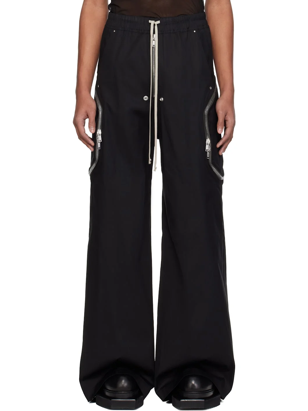 Stretch organic cotton poplin cargo pants. · GOTS-certified organic cotton · Loose-fit · Drawstring at elasticized waistband · Four-pocket styling · Exposed zip fly · Eyelets and press-studs at front · Creased legs · Two-way zip pocket at outseams · Dropped inseam Supplier color: Black 97% cotton, 3% elastane. Made in Italy 261232M188013
