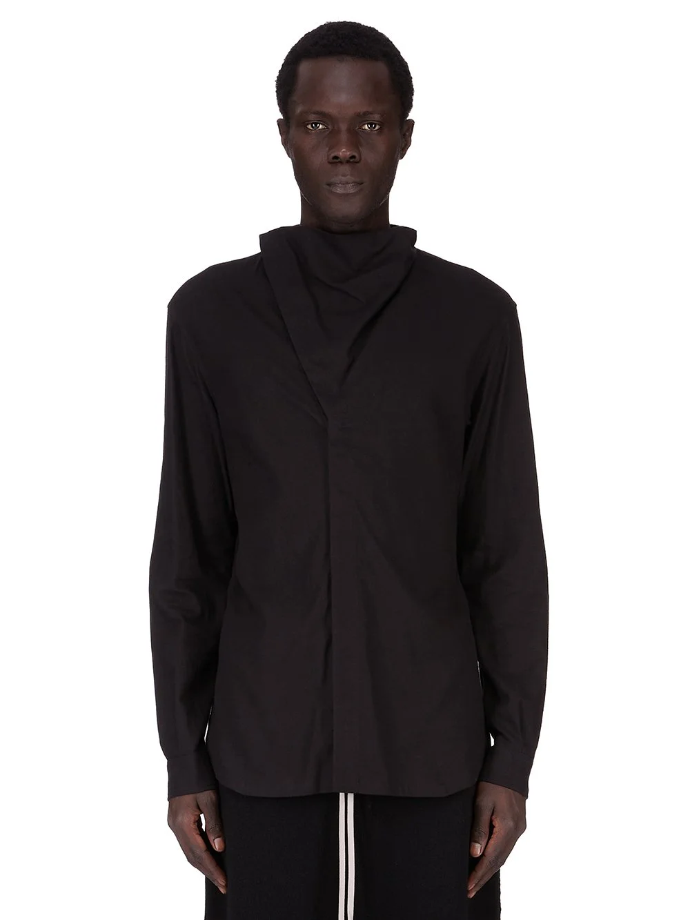 RICK OWENS FW25 CONCORDIANS ISLAND SHIRT IN BLACK WOOL FLANNEL THISLAND SHIRT IS HIP-LENGTH WITH LONG SLEEVES AND SINGLE BUTTON CUFFS. IT FEATURES A FRONT OPENING WITH CONCEALED BUTTON CLOSURES THAT VEERS TO THE RIGHT, UNDER THE CHIN, AND INTO A POINT, CREATING A SLIGHT DRAPE AT FRONT AND A SMALL, ROUNDED, FUNNEL NECK AT BACK IT HAS A BACK YOKE AND A HEMLINE WITH BEVELED SIDE SPLITS THIS LIGHTWEIGHT WOOL AND COTTON BLEND FLANNEL HAS A SOFT AND BRUSHED HANDFEEL THIS FABRIC IS MADE USING GOTS CERTIFIED ORGANIC COTTON AND RWS CERTIFIED WOOL COLOR: BLACK MATERIAL: 81% COTTON + 19% WOOL BUTTONS 100% BUFFALO HORN MODEL IS 189CM TALL MODEL WEARS SIZE 48