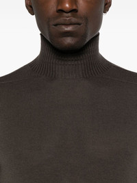 high-neck wool sweater Highlights - Dark dust - High neck - Long sleeves - Ribbed cuffs - Ribbed hem - Metallic detail Made in Italy Composition RWS Virgin Wool 100% SIZE & FIT Model measurements Height 6 ft 0 in(1.84 m) Bust/Chest 37.79 in(96 cm) Hips 37 in(94 cm) Waist 31.49 in(80 cm) Washing instructions Hand Wash