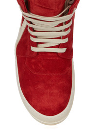 RICK OWENS SS26 TEMPLE GEOBASKET CARNELIAN/MILK/MILK SUEDE LEATHER AND FULL GRAIN CALF LEATHER THESE GEOBASKETS ARE ABOVE-ANKLE HEIGHT. THEY FEATURE AN EXTENDED TONGUE WITH WEBBING TAB, SIGNATURE GEOMETRIC PANELS AND A PADDED BACK COUNTER WITH LINES OF TOPSTITCHING. THEY HAVE CONTRAST LACES, A ZIPPER ON THE INSIDE ANKLE FOR EASY FASTENING AND SHARK-TOOTHED BUMPER SOLE. THIS IS A COMBINATION OF SUEDE LEATHER AND FULL GRAIN CALF LEATHER. THIS MEDIUMWEIGHT CROSTA SUEDE LEATHER IS MATTE WITH A HAIRY SURFACE TEXTURE. IT HAS A NATURAL AND WAXY HAND FEEL ACHIEVED BY DRUMMING THE SKINS WITH WAX. THIS TANNERY IS LWG CERTIFIED WITH A SILVER RATING. COLOR: CARNELIAN/MILK/MILK MATERIAL: UPPER 100% CALF LEATHER DETAIL 100% COW LEATHER LINING 100% CALF LEATHER INSOLE 100% CALF LEATHER SOLE 100% THERMOPLASTIC RUBBER SOLE HEIGHT 3.5CM