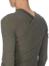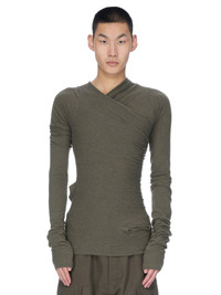 RICK OWENS FW25 CONCORDIANS HOLLYWOOD BANANA LS T IN BOSCO RAININO JERSEY THIS HOLLYWOOD BANANA LS T IS ABOVE HIP LENGTH WITH LONG SLEEVES. IT HAS AN UNDER LAYER WITH TWO ROUND HOLES WITH RIB EDGES, AND AN OUTER LAYER THAT FOLDS UP TO CREATE A CRISS CROSS DRAPED NECK FRONT AND BACK THIS MEDIUMWEIGHT AND FLUID VISCOSE AND WOOL BLEND JERSEY HAS A SOFT, WARM HANDFEEL AND A SLIGHTLY HAIRY SURFACE TEXTURE. WE STRIVE TO KEEP OUR PRODUCTION AS LOCAL AS POSSIBLE. THE FULL MANUFACTURING CYCLE OF THIS PRODUCT, FROM THE MATERIAL KNITTING TO SEWING AND FINISHING, WAS UNDERTAKEN CLOSE TO OUR HOME BASE IN CONCORDIA, ITALY. THIS JERSEY IS MADE FROM CERTIFIED VISCOSE AND RWS CERTIFIED WOOL. COLOR: BOSCO MATERIAL: 30% VISCOSE + 30% NYLON + 20% ANGORA + 20% WOOL MODEL IS 189CM TALL MODEL WEARS SIZE S