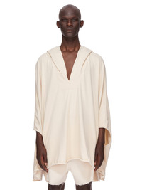 RICK OWENS SS25 HOLLYWOOD RUNWAY HOODED KAFTAN IN NATURAL COMPACT COTTON JERSEY THIS HOODED KAFTAN IS MID-THIGH LENGTH. IT HAS A LARGE HOOD WITH A V NECK AND A SEAM RUNNING DOWN THE CENTRE FRONT. IT IS A VOLUMINOUS KAFTAN SHAPE, WITH A WIDE SHOULDER THAT FALLS INTO A DROPPED ARMHOLE, EXPOSING THE HAND AT THE WRIST. IT FEATURES A GEO LINE, RUNNING ACROSS THE SHOULDER, AND THEN DIAGONALLY DOWN THE SIDE BODY THIS HEAVYWEIGHT AND COMPACT COTTON JERSEY HAS A BRUSHED AND SOFT HANDFEEL. THE COLOR OF THIS JERSEY IS NATURAL WITH VISIBLE SLUBS AND IMPURITIES NATURAL TO THE COTTON FIBRE. THIS JERSEY IS GARMENT WASHED. THIS FABRIC IS MADE USING GOTS CERTIFIED ORGANIC COTTON WHICH MEANS THE NATURAL FIBER IS GROWN WITHOUT HARMFUL CHEMICALS, LEAVING OUR SOIL, AIR AND WATER CLEANER FROM CONTAMINATES COLOR: NATURAL MATERIAL: 100% COTTON MODEL IS 189CM TALL
