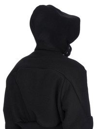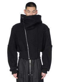 RICK OWENS FW25 CONCORDIANS CROPPED HOODED FLIGHT IN BLACK MELTON THIS CROPPED HOODED FLIGHT IS ABOVE-HIP LENGTH WITH LONG SLEEVES. IT HAS A FRONT ZIP SLOPING FROM THE CENTRE HEM TO THE RIGHT SIDE OF THE NECK WITH A LARGE HOOD THAT CLOSES WITH SNAPS. IT FEATURES GIRDERED LEVEL SHOULDERS, AND A YOKE THAT ARCS FROM THE CENTRE CHEST, OVER THE SHOULDER TO FINISH IN SQUARE POINTS ON THE UPPER ARM. IT FEATURES A ZIPPERED POCKETS ON BOTH FOREARMS. THIS VERSION IS FULLY LINED THIS HEAVYWEIGHT AND COMPACT WOOL MELTON HAS A FLAT, MATTE FINISH AND A SOFT HANDFEEL COLOR: BLACK MATERIAL: 100% NEW WOOL KNIT RIB CUFFS AND BOTTOM 100% NEW WOOL YOKE LINING 97% COTTON + 3% ELASTANE HOOD LINING AND POCKETS 100% COTTON SLEEVES LINING 100% CUPRO MODEL IS 189CM TALL MODEL WEARS SIZE 48