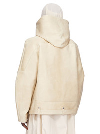 RICK OWENS SS25 HOLLYWOOD RUNWAY HOODED STOOGES IN PARCHMENT PARCHMENT LAMB LEATHER THIS HOODED STOOGES IS BELOW-HIP LENGTH WITH LONG SLEEVES. IT HAS A FRONT ZIPPER SLOPING FROM THE CENTRE HEM TO THE RIGHT SIDE OF THE NECK AND A LARGE HOOD THAT CLOSES WITH SNAPS. IT FEATURES GIRDERED, LEVEL SHOULDERS, AND A YOKE THAT ARCS FROM THE CENTRE CHEST, OVER THE SHOULDER, FINISHING IN SQUARE POINTS ON THE UPPER ARM. IT FEATURES SIDE ZIPPERED POCKETS, A ZIPPERED POCKET ON THE LEFT SIDE BODY AND CONCEALED ZIP POCKETS IN BOTH FOREARMS. IT HAS A DETACHABLE BELT RUNNING THROUGH LOOPS ON THE BACK WAISTBAND THAT CLOSES WITH TWO D-RINGS.IT IS FULLY LINED WITH TWO INTERNAL ZIPPERED POCKETS. THIS HEAVYWEIGHT SPALLA COW LEATHER IS VEG TANNED AND WAS MADE INSPIRED BY THE COLORATION AND SHADINGS OF NATURAL PARCHMENT LEATHER. BECAUSE THIS SKIN IS NAKED, NOT FINISHED USING ANY PIGMENTS COVERING THE SKIN, NATURAL MARKINGS AND SHADINGS ARE VISIBLE WHICH MAKES EACH SKIN AND PRODUCT UNIQUE. VEG TANNING MEANS ONLY VEGETAL AND NATURAL TANNINS WERE USED IN THE PROCESS OF TANNING AND PRESERVING THIS LEATHER. COLOR: PARCHMENT MATERIAL: 100% LAMB LEATHER LINING 100% CUPRO INSERT SHOULDER PADDING 100% POLYESTER MODEL IS 189CM TALL ITEM IS AVAILABLE IN ONE SIZE