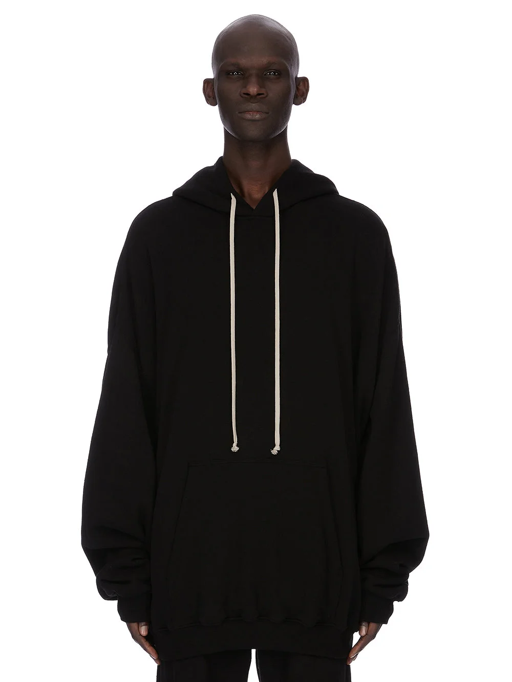 RICK OWENS SS26 TEMPLE HUN HOODIE IN BLACK NEP TERRY JERSEY THIS HUN HOODIE IS BELOW HIP LENGTH WITH LONG, WIDE SLEEVES WITH LOW SHOULDERS AND AN OVERSIZED FIT. IT HAS A BIG HOOD WITH DRAWSTRINGS, A BIG FRONT POCKET WITH OPENINGS ON EACH SIDE. IT HAS RIBBED CUFFS AND HEM, AND A SINGLE CHANNEL RUNNING DOWN THE CENTRE BACK SPINE. THIS HEAVYWEIGHT JERSEY IS KNITTED USING TEXTURED NEP YARNS AND HAS A BRUSHED FINISH. THIS JERSEY IS MADE USING GOTS CERTIFIED ORGANIC COTTON WHICH MEANS THE NATURAL FIBER IS GROWN WITHOUT HARMFUL CHEMICALS, LEAVING OUR SOIL, AIR AND WATER CLEANER FROM CONTAMINATES. COLOR: BLACK MATERIAL:100% COTTON MODEL IS 189CM TALL ITEM IS AVAILABLE IN ONE SIZE