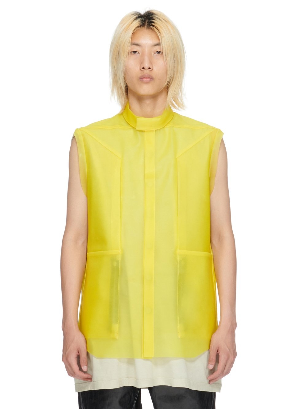 RICK OWENS SS23 EDFU RUNWAY SL EDFU OUTERSHIRT IN TRANSPARENT COW LEATHER THIS EDFU OUTERSHIRT SL IS BELOW HIP LENGTH AND SLEEVELESS, WITH A BOXY FIT. IT HAS A CENTRE FRONT OPENING WITH CONCEALED SNAP CLOSURES, AND A STRUCTURED PRIESTS' COLLAR. IT HAS A HEMLINE WITH BEVELED SIDES AND TWO FOG BREAST POCKETS WITH A VERTICAL OPENING WITH CONCEALED SNAPS AND TOPSTITCHING. IT FEATURES THE SIGNATURE LEVEL SHOULDER SEAMS IT IS UNLINED, WITH TWO INTERNAL ZIPPERED POCKETS THIS SEMI-TRANSPARENT LEATHER WAS CREATED BY A DUTCH TANNERY INSPIRED BY ANCIENT PARCHMENT. FULL GRAIN COW HIDES ARE TANNED USING ONLY ORGANIC MATERIALS AND NATURAL GLYCERINE THAT FILLS THE PORES OF THE LEATHER AND GIVES IT ITS SOFTNESS AND TRANSPARENCY. - COLOR: LEMON - MATERIAL: 100% CALF LEATHER - MODEL IS WEARING SIZE 48 - MODEL IS 189 CM TALL