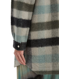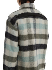 RICK OWENS FW22 STROBE OVERSIZED OUTERSHIRT IN PEARL ALPACA WOOL PLAID THIS OVERSIZED OUTERSHIRT IS MID-THIGH LENGTH WITH AN OVERSIZED BOXY FIT. IT HAS A CENTRE FRONT OPENING WITH VISIBLE SNAP CLOSURES, A CLASSIC SHIRT COLLAR, BEVELED SIDE SEAMS WITH SPLITS, SNAP CUFFS AND DOUBLE TOPSTITCHING. IT FEATURES TWO CHEST POCKETS WITH BEVELED EDGE FLAP, VISIBLE SNAP CLOSURES AND INTERNAL ZIPPERED POCKET. IT HAS THE SIGNATURE LEVEL SHOULDER SEAMS AND A COTTON WEBBING STRAP WITH RIVET DETAIL ON THE BACK YOKE THIS HEAVYWEIGHT ALPACA WOOL COATING HAS A WOVEN MULTI-COLORED PLAID MOTIF AND A BRUSHED FELTED FINISH - COLOR: PEARL PLAID - MATERIAL: 60% WOOL + 40% ALPACA - INSIDE POCKETS 97% COTTON + 3% ELASTANE - YOKE LINING 100% COTTON - MODEL IS WEARING SIZE 48 - MODEL IS 189 CM TALL