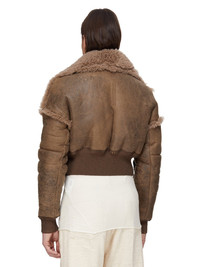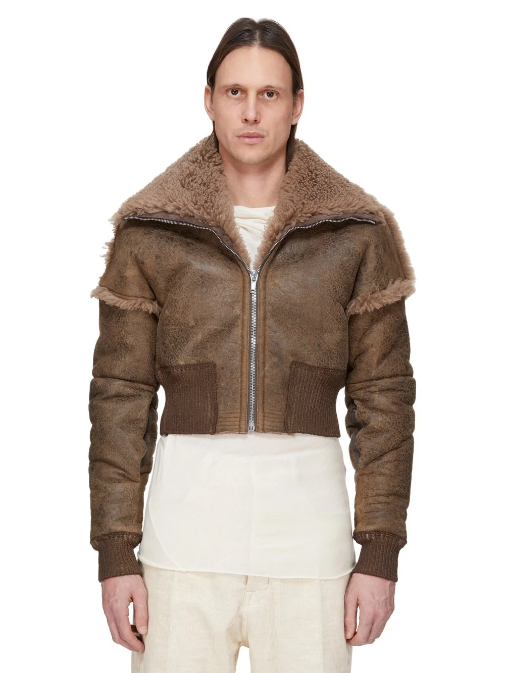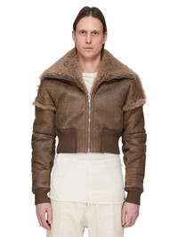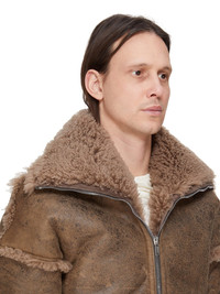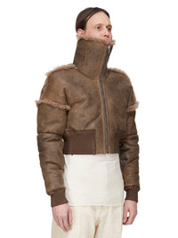 RICK OWENS FW25 CONCORDIANS RUNWAY DRACUCOLLAR JKT IN DNA DUST CURLY SHEARLING THIS DRACUCOLLAR JKT IS WAIST LENGTH WITH LONG SLEEVES AND A DROPPED SHOULDER. IT HAS A CENTRE FRONT ZIPPER CLOSURE AND A WIDE RIBBED WAISTBAND CUFFS AND A CONCEALED ZIPPER POCKET IN THE LEFT FOREARM. IT FEATURES AN EXTENDED LENGTH COLLAR THAT CAN BE WORN UP OR DOWN AND HOLDS ITS SHAPE THANKS TO IT BEING REINFORCED WITH FUSING MATERIAL. IT IS FULLY LINED AND HAS TWO INTERNAL ZIPPERED POCKETS. THIS HEAVYWEIGHT SHEARLING LAMB LEATHER HAS A WAXY NAPPA FINISH AND A SOFT NATURAL FUR TANNED IN THE TUSCANY AREA OF ITALY, THESE SHEARLING MERINO HIDES ARE OF SPANISH ORIGIN, THE UNIQUE THICK FUR OF THESE ANIMALS MAKE THEM PERFECT FOR SHEARLING. BECAUSE THE HAIR IS NATURAL, THERE WILL BE VARIATIONS IN HAIR LENGTH AND TEXTURE, MAKING EACH PIECE UNIQUE THIS TANNERY IS LWG CERTIFIED WITH A SILVER RATING COLOR: DNA DUST MATERIAL: 100% LAMB SHEARLING REAL FUR KNIT RIB CUFFS AND BOTTOM 94% NEW WOOL + 5% NYLON + 1% ELASTANE ZIPPER EDGE 100% CALF LEATHER MODEL IS 189CM TALL MODEL WEARS SIZE 48