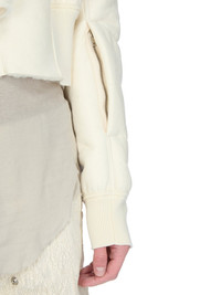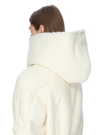 RICK OWENS FW25 CONCORDIANS CROPPED HOODED FLIGHT IN MILK ALBINO SHEARLING THIS CROPPED HOODED FLIGHT IS ABOVE-HIP LENGTH WITH LONG SLEEVES. IT HAS A FRONT ZIP SLOPING FROM THE CENTRE HEM TO THE RIGHT SIDE OF THE NECK WITH A LARGE HOOD THAT CLOSES WITH SNAPS. IT FEATURES GIRDERED LEVEL SHOULDERS, AND A YOKE THAT ARCS FROM THE CENTRE CHEST, OVER THE SHOULDER TO FINISH IN SQUARE POINTS ON THE UPPER ARM. IT FEATURES A ZIPPERED POCKETS ON BOTH FOREARMS. THIS VERSION FEATURES A SOFT NATURAL LENGTH SHORT FUR ON THE INSIDE THIS HEAVYWEIGHT SHEARLING LAMB LEATHER HAS A SEMI SHINY, WAXY NAPPA FINISH AND A SOFT NATURAL LENGTH FUR TANNED IN THE TUSCANY AREA OF ITALY USING A METAL FREE TANNING PROCESS, THESE SHEARLING MERINO HIDES ARE OF SPANISH ORIGIN, THE UNIQUE THICK FUR OF THESE ANIMALS MAKE THEM PERFECT FOR SHEARLING. BECAUSE THE HAIR IS NATURAL, THERE WILL BE VARIATIONS IN HAIR LENGTH AND TEXTURE, MAKING EACH PIECE UNIQUE THIS TANNERY IS LWG CERTIFIED WITH A SILVER RATING COLOR: MILK MATERIAL: 100% LAMB SHEARLING REAL FUR KNIT RIB CUFFS AND BOTTOM 94% NEW WOOL + 5% NYLON + 1% ELASTANE INTERNAL EDGES 100% CALF LEATHER POCKETS LINING 100% COTTON MODEL IS 189CM TALL MODEL WEARS SIZE 48
