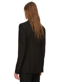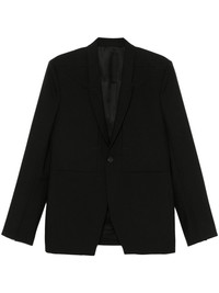 RICK OWENS FW24 PORTERVILLE FOGPOCKET SOFT SOFT BLAZER IN BLACK GRAIN DE POUDRE THIS FOGPOCKET SOFT SOFT BLAZER IS BELOW HIP-LENGTH WITH LONG SLEEVES AND A CLASSIC SOFT SHOULDER PAD. IT HAS A SLIM LAPEL WITH SINGLE BUTTON FRONT CLOSURE, TWO FOG BREAST POCKETS WITH A VERTICAL OPENING AND INTERNAL SNAP, AND TWO SIDE SEAM POCKETS. IT HAS TWO SIDE BACK VENTS AND FIVE-BUTTON CUFFSIT IS FULLY LINED AND HAS TWO INTERNAL BUTTONED POCKETS THIS MEDIUMWEIGHT WOOL GRAIN DE POUDRE FABRIC HAS A ROUND AND SOFT HANDFEEL.THIS FABRIC IS MADE FROM RWS CERTIFIED VIRGIN WOOL WHICH ENSURES A HIGH STANDARD IN ANIMAL WELFARE, ENVIRONMENTAL SUSTAINABILITY AND SOCIAL RESPONSIBILITY. EACH BALE OF WOOL IS TRACEABLE BACK TO ITS SOURCE. - COLOR: BLACK - MATERIAL: 100% NEW WOOL - FRONT AND POCKETS LINING 100% COTTON - BACK AND SLEEVES LINING 100% CUPRO - BUTTONS 100% BUFFALO HORN - MODEL IS 189CM TALL - MODEL WEARS SIZE 48