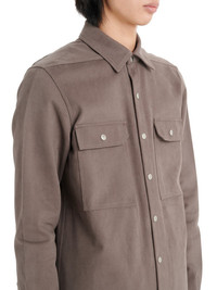 RICK OWENS FW22 STROBE OUTERSHIRT IN DUST GREY HEAVY COTTON FLANNEL THIS OUTERSHIRT IS BELOW HIP LENGTH WITH A BOXY FIT. IT HAS A CENTRE FRONT OPENING WITH VISIBLE SNAP CLOSURES, A CLASSIC SHIRT COLLAR, BEVELED SIDE SEAMS WITH SPLITS, SNAP CUFFS AND DOUBLE TOPSTITCHING. IT FEATURES TWO CHEST POCKETS WITH BEVELED EDGE FLAP, VISIBLE SNAP CLOSURES AND INTERNAL ZIPPERED POCKET. IT HAS THE SIGNATURE LEVEL SHOULDER SEAMS AND A COTTON WEBBING STRAP WITH RIVET DETAIL ON THE BACK YOKE THIS COTTON TWILL HAS A SOFT BRUSHED FINISH AND IS WOVEN FROM GOTS CERTIFIED ORGANIC COTTON FROM A LOCAL ITALIAN MILL THAT WAS FOUNDED IN 1597. WE CHOSE TO MAKE THIS GARMENT USING CERTIFIED ORGANIC COTTON BECAUSE IT MEANS THE NATURAL FIBER IS GROWN WITHOUT HARMFUL CHEMICALS, WHICH LEAVES OUR SOIL, AIR AND WATER CLEANER FROM CONTAMINATES - COLOR: DUST GREY - MATERIAL: 100% COTTON - BODY LINING 53% VISCOSE + 47% CUPRO - SLEEVES LINING 100% CUPRO - PADDING 90% POLYESTER + + 10% ACRYLIC- MODEL IS WEARING SIZE 48 - MODEL IS 189 CM TALL