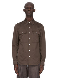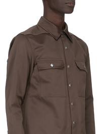 RICK OWENS SS26 TEMPLE OUTERSHIRT IN DARK DUST TECH DUCHESSE THIS OUTERSHIRT IS HIP LENGTH WITH A BOXY FIT. IT HAS A CENTRE FRONT OPENING WITH VISIBLE SNAP CLOSURES, A CLASSIC SHIRT COLLAR, BEVELED SIDE SEAMS, SNAP CUFFS AND DOUBLE TOPSTITCHING. IT FEATURES TWO SQUARE CHEST POCKETS WITH BEVELED FLAPS, SIGNATURE LEVEL SHOULDER SEAMS AND A COTTON WEBBING STRAP WITH RIVET DETAIL ON THE BACK YOKE THIS MEDIUMWEIGHT TECHNICAL DUCHESSE SATIN HAS A SHINY SURFACE AND CRISP HANDFEEL THIS FABRIC IS MADE USING GRS CERTIFIED RECYCLED POLYESTER WHICH ENSURES A REDUCTION IN WATER CONSUMPTION, EMISSIONS AND HAZARDOUS WASTE, LESSENING THE DEPENDENCE ON NON-RENEWABLE RESOURCES COLOR: DARK DUST MATERIAL:100% POLYESTER INSIDE POCKETS 97% COTTON + 3% ELASTANE MODEL IS 189CM TALL MODEL WEARS SIZE 48