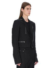 RICK OWENS FW25 CONCORDIANS ALICE JKT IN BLACK/PEARL GRAIN DE POUDRE THIS ALICE JACKET IS ABOVE HIP LENGTH WITH LONG SLIM SLEEVES. IT HAS CLASSIC SLOPING SHOULDERS AND A SLIM LAPEL, WITH A SINGLE BUTTON CLOSURE. IT FEATURES AN XXL VERTICAL APPLIED ZIPPERED POCKET ON THE LEFT SIDE, WITH A BIG RING PULL, A SMALLER VERTICAL CHEST POCKET AND ONE LOWER ZIPPERED POCKET ON THE RIGHT. IT FEATURES STITCHING DETAIL ON THE RIGHT SLEEVE, SHOULDER LINES, AND LINES UNDER LEFT POCKET. THE SHOULDERS FEATURE A FOUR SNAP DETAIL. IT HAS 5 BUTTON CUFFS, DOUBLE BACK VENTS AND FEATURES AN ADJUSTABLE, THIN COTTON WEBBING DISCO STRAP, WITH CLIP, ACROSS THE BACK YOKE.IT IS FULLY LINED AND HAS TWO INTERNAL BUTTONED POCKETS THIS MEDIUMWEIGHT WOOL GRAIN DE POUDRE FABRIC HAS A ROUND AND SOFT HANDFEEL THIS FABRIC IS MADE FROM RWS CERTIFIED VIRGIN WOOL WHICH ENSURES A HIGH STANDARD IN ANIMAL WELFARE, ENVIRONMENTAL SUSTAINABILITY AND SOCIAL RESPONSIBILITY. EACH BALE OF WOOL IS TRACEABLE BACK TO ITS SOURCE COLOR: BLACK/PEARL MATERIAL: 100% NEW WOOL BODY AND POCKETS LINING 100% COTTON SLEEVES LINING 100% CUPRO BUTTONS 100% BUFFALO HORN MODEL IS 189CM TALL MODEL WEARS SIZE 48
