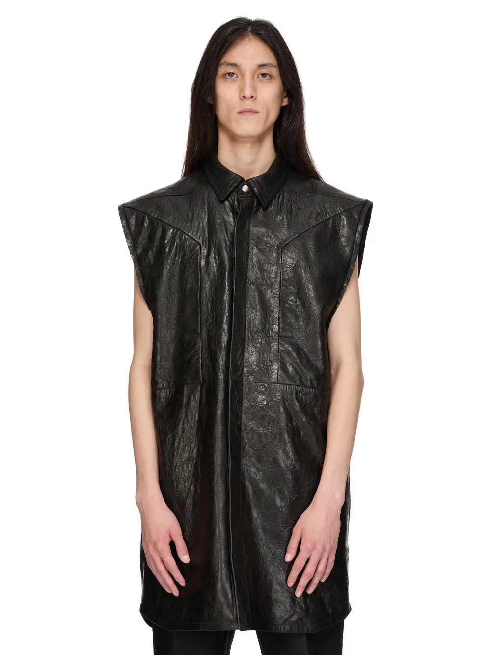 RICK OWENS SS26 TEMPLE JUMBO SL OUTERSHIRT IN BLACK TUMBLED LAMB THIS JUMBO SL OUTERSHIRT IS MID-THIGH LENGTH AND SLEEVELESS, WITH A JUMBO BOXY FIT. IT HAS A CLASSIC COLLAR, TOP SNAP AND CONCEALED SNAP FRONT CLOSURES, CHEST FOG POCKETS WITH CONCEALED SNAP CLOSURE, BEVELED SIDE SEAMS AND DOUBLE TOPSTITCHING. IT FEATURES SIGNATURE LEVEL SHOULDER SEAMS AND A COTTON WEBBING STRAP WITH RIVET DETAIL ON THE BACK YOKE. IT HAS TWO INTERNAL ZIPPERED POCKETS THIS MEDIUMWEIGHT LAMB LEATHER IS VEG TANNED AND FINISHED WITH ANILINE. THE SURFACE TEXTURE, WHICH IS THE NATURAL GRAIN OF THE SKIN, IS ACHIEVED BY TUMBLING THE SKINS FOR 15 HOURS IN A WOODEN DRUM VEG TANNING MEANS ONLY VEGETAL AND NATURAL TANNINS WERE USED IN THE PROCESS OF TANNING AND PRESERVING THIS LEATHER THIS TANNERY IS LWG AUDITED COLOR: BLACK MATERIAL:100% LAMB LEATHER BODY AND POCKETS LINING 100% COTTON MODEL IS 189CM TALL MODEL WEARS SIZE 48