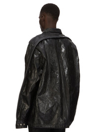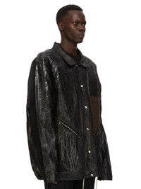 RICK OWENS FW24 PORTERVILLE RUNWAY TOUR JKT IN BLACK/BROWN/BLACK 13OZ MEGACRUST TURBO DENIM, LODEN FELT AND RECYCLED TYRE THIS TOUR JKT IS BELOW HIP LENGTH, WITH LONG SLEEVES AND AN OVERSIZED FIT. IT HAS A CENTRE FRONT OPENING WITH VISIBLE SNAPS, LEVEL SHOULDER SEAMS AND A CLASSIC COLLAR, A WAISTBAND WITH DRAWSTRING, AND SNAP CUFFS. IT HAS TWO LARGE, APPLIED, FOG UTILITY POCKETS WITH DIAGONAL ZIPPERS, AND A TRIANGULAR CONTRAST FABRIC APPLIQUE ON THE RIGHT SIDE. IT FEATURES A RUBBER TIRE DETAIL, STARTING AT THE RIGHT SHOULDER, ARCHING, ACROSS THE BACK, FINISHING AT THE LEFT WRISTIT IS FULLY LINED AND HAS TWO INTERNAL ZIPPERED POCKETS THIS IS A COMBINATION OF 13OZ MEGACRUST TURBO DENIM, LODEN FELT AND RECYCLED TYRE. THIS HEAVYWEIGHT MEGACRUST TURBO DENIM IS MADE ON A 13OZ BLACK AND NATURAL JAPANESE DENIM. THE READY GARMENT IS OVERDYED BLACK AND TREATED WITH A WAX FINISH, THEN SEVERAL LAYERS OF BLACK FOIL IS PRESSED ON TOP AND A FINAL WASH MAKES THE FOIL PEEL AND CRACK. THE NATURAL ASPECTS OF THIS TREATMENT MEANS THE FOIL HAS PEELED OFF AND CRACKED IN CERTAIN AREAS AND WILL CONTINUE TO DO SO WITH WEAR AND ABRASION. THIS IS AN INHERENT CHARACTERISTIC OF THIS TYPE OF TREATMENT AND IS A DESIRED A VISUAL ASPECT WHICH ADDS TO THE UNIQUENESS OF EACH PIECE. - COLOR: BLACK/BROWN/BLACK - MATERIAL: 100% COTTON - FRONT LEFT POCKET 100% NEW WOOL - DETAIL YOKE AND LEFT SLEEVE 100% NATURAL RUBBER - MODEL IS 189CM TALL - MODEL WEARS SIZE 48