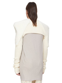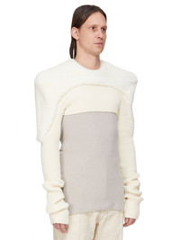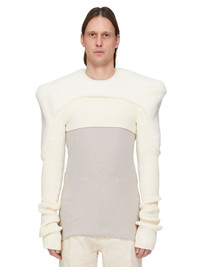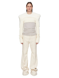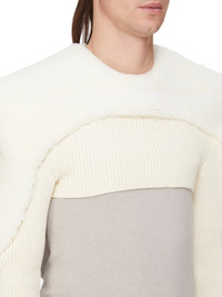 RICK OWENS FW25 CONCORDIANS RUNWAY TIGHT PULLOVER IN MILK ALBINO SHEARLING THIS TIGHT PULLOVER JKT IS CHEST LENGTH. IT IS CLOSE-FITTING, WITH LONG, RIB KNIT SLEEVES. IT FITS OVER THE HEAD AND SHOULDERS LIKE A PULLOVER AND LAYS IN PLACE, OVER THE BUST. IT FEATURES STRUCTURED, WIDE TATLIN SHOULDERS WITH A GIRDERED SHOULDER SEAM, AND YOKE THAT IS HORIZONTAL ACROSS THE CHEST AND DESCENDS DOWN THE ARM, TO FINISH IN A BLUNT POINT AT THE ELBOW THIS HEAVYWEIGHT SHEARLING LAMB LEATHER HAS A SEMI SHINY, WAXY NAPPA FINISH AND A SOFT NATURAL LENGTH FUR TANNED IN THE TUSCANY AREA OF ITALY USING A METAL FREE TANNING PROCESS, THESE SHEARLING MERINO HIDES ARE OF SPANISH ORIGIN, THE UNIQUE THICK FUR OF THESE ANIMALS MAKE THEM PERFECT FOR SHEARLING. BECAUSE THE HAIR IS NATURAL, THERE WILL BE VARIATIONS IN HAIR LENGTH AND TEXTURE, MAKING EACH PIECE UNIQUE THIS TANNERY IS LWG CERTIFIED WITH A SILVER RATING COLOR: MILK MATERIAL: 100% LAMB SHEARLING REAL FUR KNIT RIB CUFFS AND BOTTOM 94% NEW WOOL + 5% NYLON + 1% ELASTANE ZIPPER EDGE 100% CALF LEATHER MODEL IS 189CM TALL MODEL WEARS SIZE 48