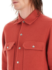 RICK OWENS FW21 GETHSEMANE OUTERSHIRT IN DOUBLE FACE WASHED CASHMERE THIS OUTERSHIRT IS BELOW-THE-HIP LENGTH AND HAS A BOXY FIT. IT HAS A CENTRE FRONT OPENING WITH VISIBLE SNAP CLOSURES, A CLASSIC SHIRT COLLAR, BEVELED SIDE SEAMS WITH SPLITS, SNAP CUFFS AND DOUBLE TOPSTITCHING. IT HAS TWO FRONT POCKETS WITH FLAPS AND SNAPS. IT FEATURES THE SIGNATURE LEVEL SHOULDER SEAMS AND COTTON WEBBING STRAP WITH RIVET DETAIL ON THE BACK YOKE THIS COATING QUALITY IS DOUBLE LAYERS OF PURE CASHMERE WASHED FOR ADDED SOFTNESS - COLOR: CARNELIAN - MATERIAL: 100% CASHMERE - YOEK AND SLEEVES LINING: 100% CUPRO - INSIDE POCKETS: 97% COTTON, 3% ELASTANE - MODEL IS WEARING SIZE 48 - MODEL IS 189 CM TALL