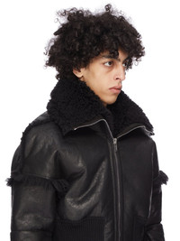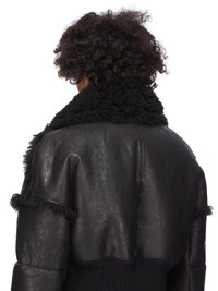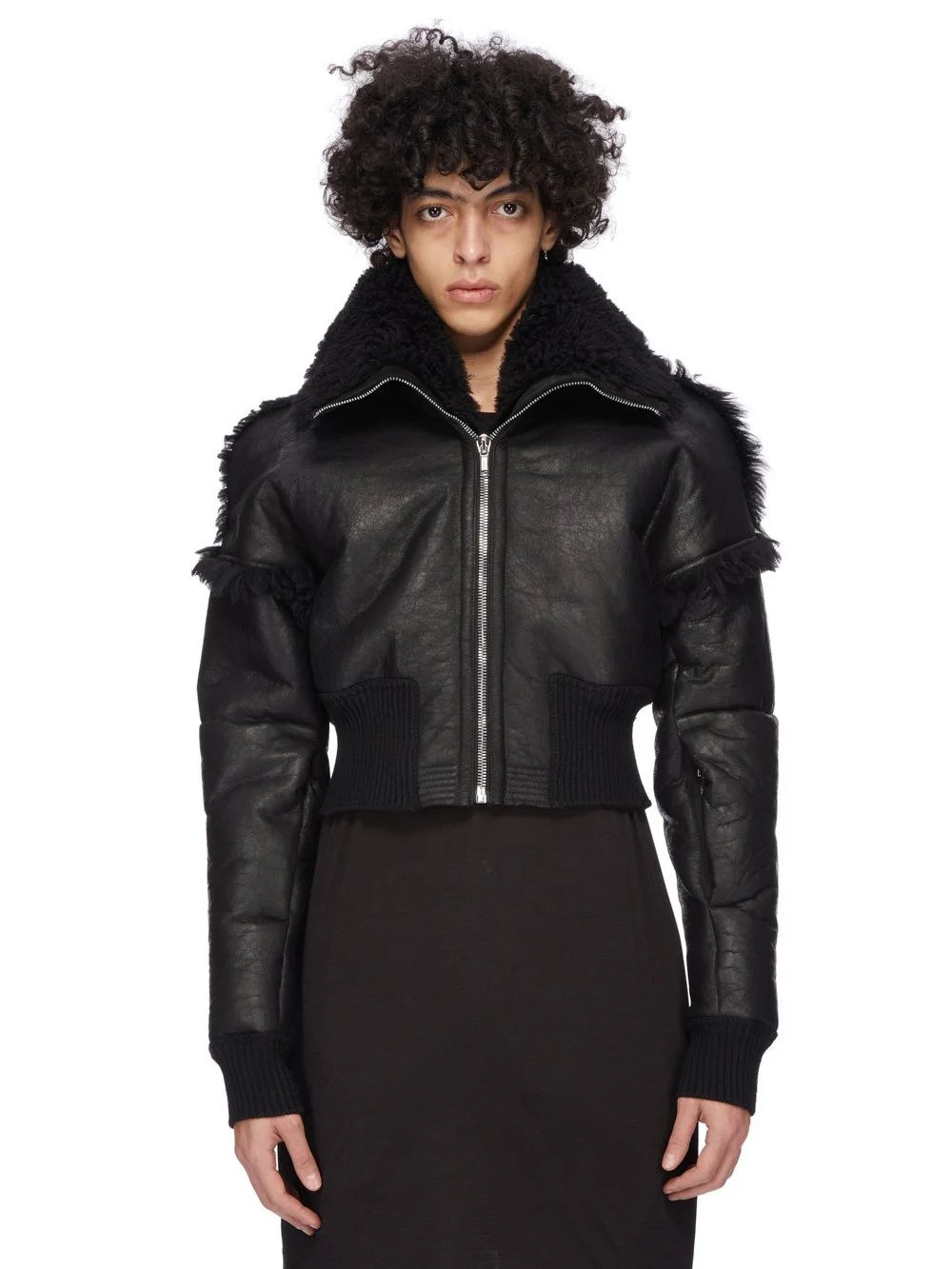 RICK OWENS FW25 CONCORDIANS RUNWAY DRACUCOLLAR JKT IN BLACK CURLY SHEARLING THIS DRACUCOLLAR JKT IS WAIST LENGTH WITH LONG SLEEVES AND A DROPPED SHOULDER. IT HAS A CENTRE FRONT ZIPPER CLOSURE AND A WIDE RIBBED WAISTBAND CUFFS AND A CONCEALED ZIPPER POCKET IN THE LEFT FOREARM. IT FEATURES AN EXTENDED LENGTH COLLAR THAT CAN BE WORN UP OR DOWN AND HOLDS ITS SHAPE THANKS TO IT BEING REINFORCED WITH FUSING MATERIAL. IT IS FULLY LINED AND HAS TWO INTERNAL ZIPPERED POCKETS. THIS HEAVYWEIGHT SHEARLING LAMB LEATHER HAS A WAXY NAPPA FINISH AND A SOFT NATURAL FUR TANNED IN THE TUSCANY AREA OF ITALY, THESE SHEARLING MERINO HIDES ARE OF SPANISH ORIGIN, THE UNIQUE THICK FUR OF THESE ANIMALS MAKE THEM PERFECT FOR SHEARLING. BECAUSE THE HAIR IS NATURAL, THERE WILL BE VARIATIONS IN HAIR LENGTH AND TEXTURE, MAKING EACH PIECE UNIQUE THIS TANNERY IS LWG CERTIFIED WITH A SILVER RATING COLOR: BLACK MATERIAL: 100% LAMB SHEARLING REAL FUR KNIT RIB CUFFS AND BOTTOM 94% NEW WOOL + 5% NYLON + 1% ELASTANE ZIPPER EDGE 100% CALF LEATHER MODEL IS 189CM TALL MODEL WEARS SIZE 48