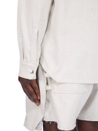 RICK OWENS SS25 HOLLYWOOD OUTERSHIRT IN DINGE 10OZ DINGE DENIM THIS OUTERSHIRT IS HIP LENGTH WITH A BOXY FIT. IT HAS A CENTER FRONT OPENING WITH VISIBLE SNAP CLOSURES, A CLASSIC SHIRT COLLAR, BEVELED SIDE SEAMS, SNAP CUFFS AND DOUBLE TOPSTITCHING IT FEATURES TWO SQUARE CHEST POCKETS WITH BEVELED FLAPS, SIGNATURE LEVEL SHOULDER SEAMS AND A COTTON WEBBING STRAP WITH RIVET DETAIL ON THE BACK YOKEIT IS UNLINED BUT HAS TWO INTERNAL ZIPPERED POCKETS THIS LIGHTWEIGHT DINGE MELANGE DENIM HAS A WASHED AND SOFT FINISH COLOR: DINGE MATERIAL: 100% COTTON INSIDE POCKETS 100% COTTON MODEL IS 189CM TALL MODEL WEARS SIZE 48