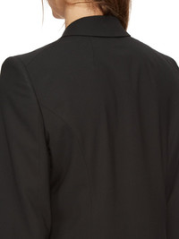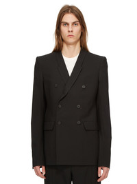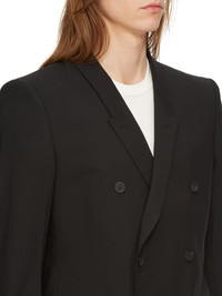 RICK OWENS FW24 PORTERVILLE JMF IN BLACK PAPER FINISH WOOL THIS JMF IS HIP-LENGTH WITH LONG SLIM SLEEVES. IT HAS A SHARP SHOULDER, A SLIM LAPEL AND A DOUBLE BREASTED FRONT WITH FOUR BUTTONS. IT HAS A WELT BREAST POCKET, SIDE POCKETS WITH FLAPS, TWO SIDE BACK VENTS AND FIVE BUTTON CUFFSIT IS FULLY LINED AND HAS TWO INTERNAL BUTTONED POCKETS THIS MEDIUMWEIGHT WOOL FABRIC HAS A DRY PAPERY HANDFEEL. IT IS WOVEN IN THE BIELLA REGION OF ITALY RENOWNED FOR ITS LONG TRADITION OF TAILORED WOOL. THIS FABRIC IS MADE FROM ZQ CERTIFIED VIRGIN WOOL WHICH ENSURES A HIGH STANDARD IN ANIMAL WELFARE, ENVIRONMENTAL SUSTAINABILITY AND SOCIAL RESPONSIBILITY. EACH BALE OF WOOL IS TRACEABLE BACK TO ITS SOURCE - COLOR: BLACK - MATERIAL: 96% NEW WOOL + 4% ELASTANE - FRONT AND POCKETS LINING 100% COTTON - BACK AND SLEEVES LINING 100% CUPRO - BUTTONS 100% BUFFALO HORN - MODEL IS 189CM TALL - MODEL WEARS SIZE 48