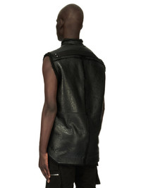 RICK OWENS FW23 LUXOR SL FOGPOCKET OUTERSHIRT IN BUTTER LAMB SHEARLING THIS SL FOGPOCKET OUTERSHIRT IS HIP LENGTH AND SLEEVELESS, WITH A BOXY FIT. IT HAS A RAW CUT V NECK COLLAR, VISIBLE SNAP FRONT CLOSURES AND BEVELED SIDE SEAMS. IT FEATURES TWO FOG BREAST POCKETS WITH INVISIBLE SNAPS, SIGNATURE LEVEL SHOULDER SEAMS AND A COTTON WEBBING STRAP WITH RIVET DETAIL ON THE BACK YOKE. THIS VERSION IS MADE OF SHEARLING WITH THE FUR FACING OUTWARDS, IT HAS RAW CUT SLEEVES AND ITS HEM IS EDGED WITH ROWS OF SIGNATURE STITCHING LINES. IT IS UNLINED AND HAS TWO INSIDE ZIPPERED POCKETS THIS SHEARLING LAMB LEATHER HAS A NATURAL WAX NAPPA FINISH AND SOFT SHAVED FUR. TANNED IN THE TUSCAN AREA OF ITALY, THESE SHEARLING MERINO HIDES ARE OF AUSTRALIAN ORIGIN, THE UNIQUE THICK FUR OF THESE ANIMALS MAKE THEM PERFECT FOR SHEARLING. THIS TANNERY IS LWG CERTIFIED WITH A BRONZE RATING. - COLOR: BLACK - MATERIAL: 100% LAMB SHEARLING REAL FUR - INSIDE POCKETS+POCKETS LINING 100% CALF LEATHER - MODEL IS WEARING SIZE 48 - MODEL IS 189 CM TALL