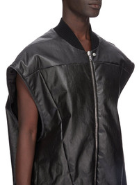 RICK OWENS SS24 LIDO JUMBO FLIGHT VEST IN BLACK COATED STRETCH DENIM THIS JUMBO FLIGHT VEST IS HIP LENGTH AND SLEEVELESS, WITH A JUMBO FIT. IT HAS A CENTRE FRONT ZIPPER WITH PLACKET AND VISIBLE TOP SNAP, SIDE SEAM POCKETS WITH INTERNAL SNAPS AND A RIBBED COLLAR, CUFFS AND WAISTBAND. IT FEATURES A FRONT AND BACK YOKE, A SIGNATURE COTTON WEBBING STRAP WITH RIVETS, AND DIAGONAL SEAM LINES RUNNING DOWN THE FRONT, AND BACK, BODYIT IS SLIGHTLY PADDED AND FULLY LINED WITH TWO INTERNAL ZIPPERED POCKETS THIS LIGHTWEIGHT STRETCH DENIM IS COVERED WITH A SEMI-SHINY AND SOFT COATING. THE INDIGO COLOR AND STRUCTURE OF THE DENIM SHINES THROUGH THE COLOR OF THE COATING CREATING A MULTILAYERED AND IRREGULAR COLORATION. THE NATURAL ASPECTS OF THIS FABRIC MEANS THE COATING HAS PEELED OFF IN CERTAIN AREAS, EXPOSING THE UNDERLAYING MATERIAL AND WILL CONTINUE TO DO SO WITH WEAR AND ABRASION. THIS IS AN INHERENT CHARACTERISTIC OF THIS TYPE OF TREATMENT AND IS A DESIRED A VISUAL ASPECT WHICH ADDS TO THE UNIQUENESS OF EACH PIECE AND SHOULD NOT BE CONSIDERED A DEFECT - COLOR: BLACK - MATERIAL: 91% COTTON + 6% ELASTOMULTIESTER + 3% RUBBER - KNIT RIB COLLAR + BOTTOM 97% CASHMERE + 3% WOOL - FRONT AND POCKETS LINING 100% COBACK LINING 53% VISCOSE + 47% CUPRO - PADDING 90% POLYESTER + + 10% ACRYLIC - MODEL IS 189CM TALL - MODEL WEARS SIZE 48