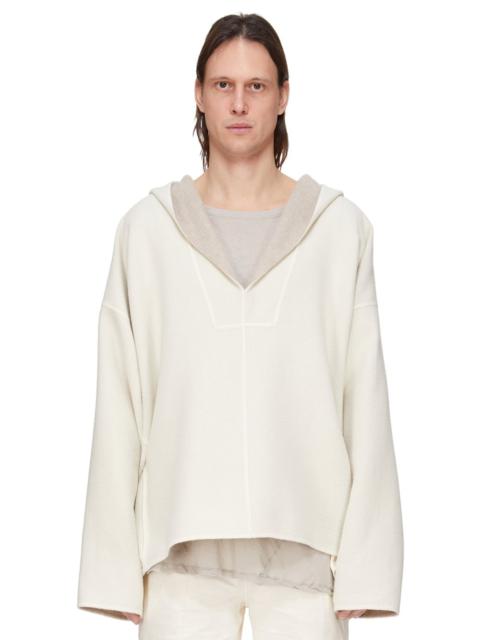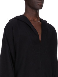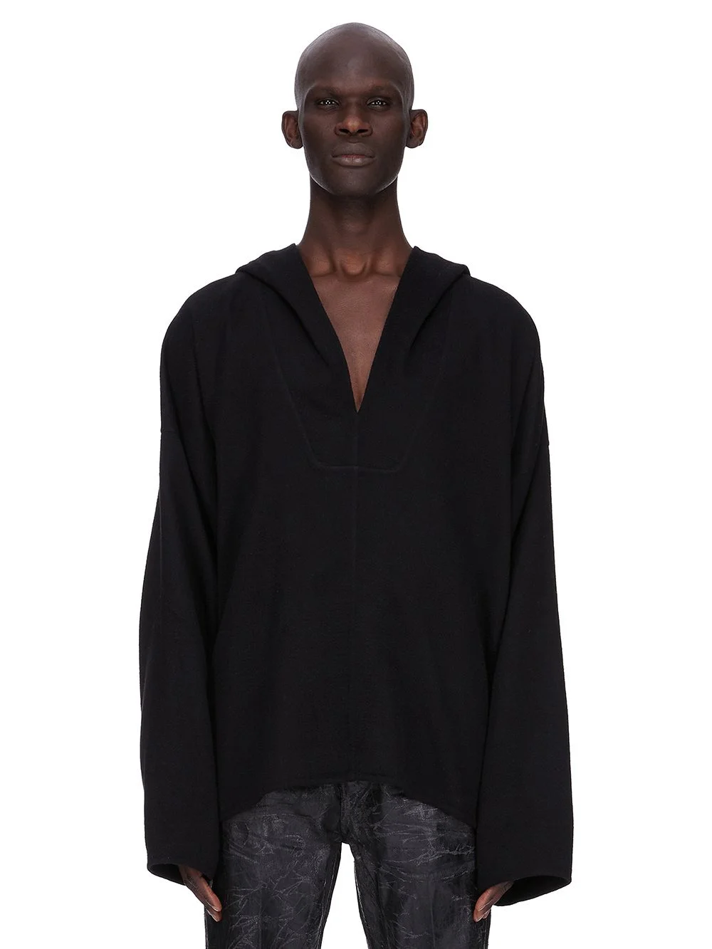 RICK OWENS FW25 CONCORDIANS RUNWAY LS KAFTAN HIP IN BLACK DOUBLE CAMEL THIS LS KAFTAN HIP IS HIP LENGTH WITH LONG, WIDE SLEEVES. IT HAS A LARGE HOOD WITH A V NECK AND SEAM RUNNING DOWN THE CENTRE FRONT AND BACK. IT IS A VOLUMINOUS KAFTAN SHAPE, WITH A WIDE SHOULDER FALLING INTO A DROPPED ARMHOLE THIS HEAVYWEIGHT DOUBLE CAMEL QUALITY IS WOVEN FROM FINE BABY CAMEL YARNS AND FINISHED BY WASHING AND TUMBLING. IT HAS A WARM AND SOFT HANDFEEL THE HIGH GRADE CAMEL HAIR USED IN THIS PRODUCT DERIVE FROM BACTRIAN CAMELS, A LONG HAIRED CAMEL NATIVE TO THE CENTRAL ASIAN STEPPES. INSTEAD OF SHEERING, THE HAIR IS COLLECTED BY BRUSHING THE CAMELS WHEN THEY NATURALLY LOOSE THEIR WINTER COAT COLOR: BLACK MATERIAL: 97% CAMEL HAIR + 3% NEW WOOL MODEL IS 189CM TALL ITEM IS AVAILABLE IN ONE SIZE