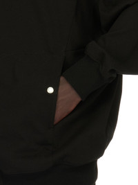 RICK OWENS FW23 LUXOR JUMBO PETER FLIGHT IN BLACK HEAVY JERSEY THIS JUMBO PETER FLIGHT IS BELOW HIP LENGTH WITH A JUMBO OVERSIZED FIT. IT HAS A CENTRE FRONT ZIPPER, TOP SNAP DETAIL, LONG SLEEVES AND LOW SHOULDERS WITH A DROPPED, BATWING-LIKE, ARMHOLE AND LEVEL SHOULDER SEAMS. IT HAS TWO SIDE SEAM POCKETS WITH VISIBLE SNAPS AND A RIBBED COLLAR, CUFFS AND HEM. THIS HEAVYWEIGHT JERSEY IS COMPACT WITH A DRY HANDFEEL. THIS JERSEY IS MADE USING GOTS CERTIFIED ORGANIC COTTON WHICH MEANS THE NATURAL FIBER IS GROWN WITHOUT HARMFUL CHEMICALS, LEAVING OUR SOIL, AIR AND WATER CLEANER FROM CONTAMINATES - COLOR: BLACK - MATERIAL: 100% COTTON - MODEL IS WEARING SIZE S - MODEL IS 189 CM TALL
