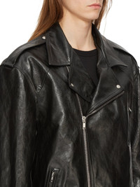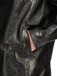 RICK OWENS FW24 PORTERVILLE JUMBO LUKE STOOGES IN BLACK RIDER CALF LEATHER THIS JUMBO LUKE STOOGES IS BELOW HIP LENGTH WITH LONG SLEEVES AND A JUMBO OVERSIZED FIT. IT FEATURES A BIKER DOUBLE BREASTED FRONT WITH AN OFF-CENTRE ZIPPER, A WIDE COLLAR AND LAPEL WITH SILVER YKK SNAPS. IT FEATURES A ZIPPER POCKET ON THE LEFT FOREARM, A DOUBLE JET POCKET WITH ZIPPERS ON THE CHEST, TWO ON THE SIDE BODY AND ONE FLAP POCKET WITH INNER SNAP ON THE LOWER BODY. IT HAS ZIPPER OPENINGS AT WRISTS, SHOULDER EPAULETTES WITH SNAP DETAILS AND A BELT ATTACHED AT THE REAR OF THE WAISTBAND WITH A SOLID BRASS PALLADIUM PLATED BUCKLE.IT IS FULLY LINED AND HAS TWO INTERNAL ZIPPERED POCKETS THIS HEAVYWEIGHT AND RIGID CALF LEATHER HAS A SHINY AND WAXY HANDFEEL. BECAUSE THIS SKIN IS NAKED, NOT FINISHED USING ANY PIGMENTS COVERING THE SKIN, NATURAL MARKINGS AND SHADINGS ARE VISIBLE WHICH MAKES EACH SKIN AND PRODUCT UNIQUE. THIS TANNERY IS LWG CERTIFIED WITH A SILVER RATING. - COLOR: BLACK - MATERIAL: 100% CALF LEATHER - FRONT AND POCKETS LINING 100% COTTON - BACK SLEEVES AND LEFT POCKET SLEEVE LINING 100% CUPRO - MODEL IS 189CM TALL - ITEMS IS AVAILABLE IN ONE SIZE