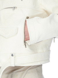 RICK OWENS FW25 CONCORDIANS CROPPED JUMBO BAUHAUS STOOGES IN MILK ALBINO LAMB LEATHER THIS CROPPED JUMBO BAUHAUS STOOGES IS ABOVE-HIP-LENGTH WITH LONG SLEEVES AND AN OVERSIZED FIT. IT FEATURES A BIKER DOUBLE BREASTED FRONT WITH OFF CENTRE ZIPPER A WIDE COLLAR AND LAPEL WITH SILVER SNAPS. IT FEATURES A ROUNDED BAUHAUS ZIPPED POCKET ON THE LEFT SIDE BODY WITH AN ADDITIONAL FLAP POCKET THAT SECURES WITH A CONCEALED SNAP. IT HAS ZIPPED SIDE FRONT POCKETS, AND SIDE BACK POCKETS, A DIAGONAL ZIPPED POCKET ON THE UPPER RIGHT ARM AS WELL AS A HORIZONTAL ZIP AT THE ELBOW, AND A ZIPPED POCKET IN THE LEFT FOREARM. IT HAS ZIP OPENINGS AT THE CUFFS, SHOULDER EPAULETTES WITH SNAP DETAILS AND A BELT RUNNING THROUGH BELT LOOPS AT THE WAISTBANDIT IS FULLY LINED WITH TWO INTERNAL ZIPPED POCKETS. THIS MEDIUMWEIGHT ALBINO LAMB LEATHER HAS A NATURAL AND WAXY HANDFEEL TANNED IN THE NAPLES AREA OF ITALY, THIS LEATHER IS MADE ON A METAL FREE TANNED WHITE BASE, TUMBLED IN ORDER TO BRING OUT THE NATURAL GRAIN TEXTURE OF THE LEATHER AND FINISHED WITH NATURAL WAX BY HAND TO ACHIEVE THE IRREGULAR ALBINO COLORATION BECAUSE THIS SKIN IS NAKED, NOT FINISHED USING ANY PIGMENTS COVERING THE SKIN, NATURAL MARKINGS AND SHADINGS ARE VISIBLE WHICH MAKES EACH SKIN AND PRODUCT UNIQUE COLOR: MILK MATERIAL: 100% LAMB LEATHER BODY AND POCKETS LINING 100% COTTON SLEEVES LINING 100% CUPRO MODEL IS 189CM TALL ITEM IS AVAILABLE IN ONE SIZE