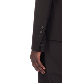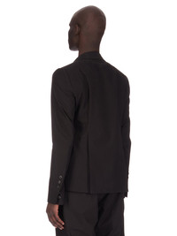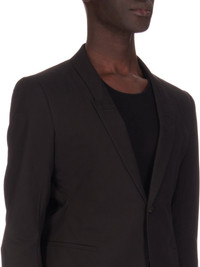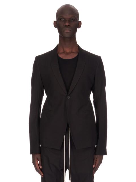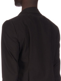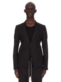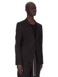 RICK OWENS SS24 LIDO 73CMS SOFT IN BLACK COTTON POPLIN THIS 73CMS SOFT BLAZER IS BELOW HIP LENGTH WITH LONG SLIM SLEEVES FEATURING A TAILORED GUSSET. IT HAS BUTTON CUFFS, A SLIM LAPEL WITH GEOMETRIC GLYPH CUT, A SINGLE BUTTON FRONT CLOSURE, TWO LOWER SIDE FRONT POCKETS WITH FLAPS, AND A DOUBLE VENT ON BACKIT IS FULLY LINED WITH TWO INTERNAL BUTTONED POCKETS THIS LIGHTWEIGHT CLASSIC POPLIN FABRIC HAS A SOFT HANDFEEL AND WASHED FINISH. THIS FABRIC IS MADE USING GOTS CERTIFIED ORGANIC COTTON WHICH MEANS THE NATURAL FIBER IS GROWN WITHOUT HARMFUL CHEMICALS, LEAVING OUR SOIL, AIR AND WATER CLEANER FROM CONTAMINATES - COLOR: BLACK - MATERIAL: 100% COTTON - FRONT AND POCKETS LINING 100% COTTON - BACK LINING 53% VISCOSE + 47% CUPRO - SLEEVES LINING 100% CUPRO - BUTTONS 100% BUFFALO HORN - MODEL IS 189CM TALL - MODEL WEARS SIZE 48