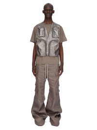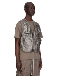 RICK OWENS SS25 HOLLYWOOD CARGO VEST IN GUNMETAL METALLIC BLISTER LAMB LEATHER THIS CARGO VEST IS ABOVE-HIP LENGTH AND SLEEVELESS. IT HAS A DEEP V NECK WITH FOUR FUNCTIONAL VISIBLE SNAP CLOSURES, AND SNAPS CONTINUING AROUND TO THE CENTER BACK NECK. IT FEATURES TWO, LARGE, ROUNDED BAUHAUS PANNIER POCKETS WITH ZIPPERS, ON THE LOWER SIDE BODY, AND 2 SMALLER POCKETS ON EITHER SIDE OF THE CHEST. IT HAS LEVEL SHOULDER SEAMS AND AN OPEN BACK THAT SECURES WITH A CENTER SNAP BELT THIS LIGHTWEIGHT LAMB LEATHER IS FINISHED WITH A GUN METAL METALLIC SPRAY. IT HAS AN EXAGGERATED UNEVEN BLISTERED TEXTURE AND A SOFT, FLUID HANDFEEL. THE BLISTERED TEXTURE IS ACHIEVED BY EXAGGERATING THE NATURAL GRAIN TEXTURE OF EACH SKIN, THEREFORE THE LOOK OF EACH SKIN IS UNIQUE. THIS LEATHER IS MADE BY A THIRD GENERATION FAMILY OWNED TANNERY IN THE SOUTH OF ITALY. COLOR: GUNMETAL MATERIAL: 100% LAMB LEATHER BODY LINING 97% COTTON + 3% ELASTANE POCKETS LINING 100% COTTON MODEL IS 189CM TALL MODEL WEARS SIZE 48
