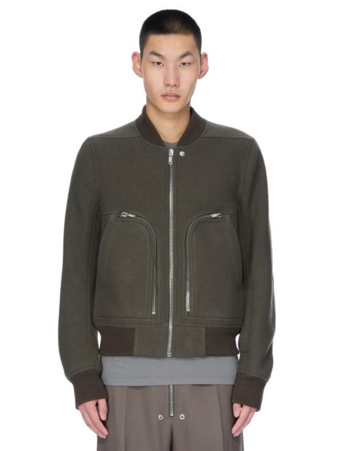 RICK OWENS FW25 CONCORDIANS BAUHAUS FLIGHT IN BOSCO BOILED WOOL THIS BAUHAUS FLIGHT IS HIP LENGTH WITH LONG SLEEVES. IT HAS A CENTER FRONT ZIPPER WITH PLACKET AND TOP SNAP, LEVEL SHOULDER SEAMS, A BACK YOKE AND RIBBED COLLAR, CUFFS AND HEM. IT FEATURES SIDE SEAM POCKETS, OVERLAYED WITH TWO SIGNATURE ROUNDED BAUHAUS ZIPPERED POCKETS. IT IS FULLY LINED AND HAS TWO INTERNAL ZIPPERED POCKETS THIS HEAVYWEIGHT WOOL FABRIC IS WOVEN IN A DIAGONAL TWILL WEAVE AND THEN FINISHED IN MULTIPLE STEPS INCLUDING TUMBLING AND BRUSHING TO ACHIEVE ITS FINAL SOFTNESS AND TEXTURE THIS FABRIC IS MADE FROM RWS CERTIFIED VIRGIN WOOL WHICH ENSURES A HIGH STANDARD IN ANIMAL WELFARE, ENVIRONMENTAL SUSTAINABILITY AND SOCIAL RESPONSIBILITY. EACH BALE OF WOOL IS TRACEABLE BACK TO ITS SOURCE COLOR: BOSCO MATERIAL: 100% NEW WOOL KNIT RIB COLLAR, WRIST BAND AND BOTTOM 100% NEW WOOL BODY AND POCKETS LINING 100% COTTONSLEEVES LINING 100% CUPRO MODEL IS 189CM TALL MODEL WEARS SIZE 48