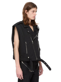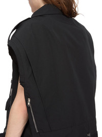 RICK OWENS SS25 HOLLYWOOD CROPPED JUMBO BAUHAUS STOOGES SLEEVELESS IN BLACK POLY COTTON CANVAS THIS CROPPED JUMBO BAUHAUS STOOGES SLEEVELESS IS ABOVE-HIP LENGTH AND SLEEVELESS. IT HAS A BIKER DOUBLE-BREASTED FRONT WITH OFF CENTER ZIPPER AND WIDE COLLAR AND LAPEL WITH SNAPS. IT FEATURES A ROUNDED BAUHAUS ZIPPERED POCKET ON THE LEFT SIDE BODY WITH AN ADDITIONAL FLAP POCKET THAT SECURES WITH A SNAP. IT HAS ZIPPERED POCKETS ON THE SIDE FRONT, SIDE BACK, LEFT BREAST. IT HAS SHOULDER EPAULETTES WITH SNAP DETAILS AND A BELT RUNNING THROUGH SNAPPED BELT LOOPS, ON THE WAISTBAND. IT IS FULLY LINED AND HAS TWO INTERNAL ZIPPERED POCKETS. THIS ITEM IS PART OF THE RICK OWENS BONOTTO CAPSULE COLLECTION AND FEATURES A SIGNATURE LABEL ON THE INTERIOR THIS MEDIUMWEIGHT COTTON AND POLYESTER CANVAS HAS A VISIBLE CANVAS STRUCTURE AND A DRY HANDFEEL. THE FABRIC HAS MINIMAL FINISHING IN ORDER TO KEEP THE NATURAL CHARACTERISTICS OF THE COTTON YARN. THIS FABRIC IS MADE USING GRS CERTIFIED RECYCLED POLYESTER WHICH ENSURES A REDUCTION IN WATER CONSUMPTION, EMISSIONS AND HAZARDOUS WASTE, LESSENING THE DEPENDENCE ON NON-RENEWABLE RESOURCES THIS FABRIC WAS WOVEN ON A 1950’S VINTAGE SHUTTLE LOOM BY BONOTTO, A 4TH GENERATION TEXTILE MILL FOUNDED IN 1912 SITUATED JUST BELOW THE PREALPS IN VENETO, ITALY. COLOR: BLACK MATERIAL: 60% POLYESTER + 40% COTTON MODEL IS 189CM TALL ITEM IS AVAILABLE IN ONE SIZE