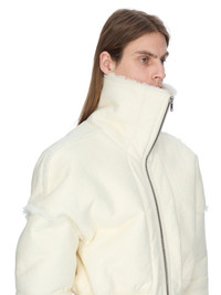 RICK OWENS FW25 CONCORDIANS FLIGHT JKT CROPPED IN MILK ALBINO SHEARLING THIS FLIGHT JKT CROPPED IS BELOW WAIST LENGTH WITH A CENTRE FRONT ZIPPER AND HIGH TUBE-NECK COLLAR. THE COLLAR CAN BORN WORN FOLDED DOWN TO REVEAL THE FUR INSIDE. IT HAS A BOXY FIT AND LOW SHOULDERS WITH VISIBLE FUR ON SEAMS. IT HAS A ZIPPERED POCKET ON THE LEFT FOREARM. IT HAS A WIDE RIBBED WAISTBAND RIBBED CUFFS. THIS VERSION FEATURES A SOFT NATURAL LENGTH SHORT FUR ON THE INSIDE THIS HEAVYWEIGHT SHEARLING LAMB LEATHER HAS A SEMI SHINY, WAXY NAPPA FINISH AND A SOFT NATURAL LENGTH FUR TANNED IN THE TUSCANY AREA OF ITALY USING A METAL FREE TANNING PROCESS, THESE SHEARLING MERINO HIDES ARE OF SPANISH ORIGIN, THE UNIQUE THICK FUR OF THESE ANIMALS MAKE THEM PERFECT FOR SHEARLING. BECAUSE THE HAIR IS NATURAL, THERE WILL BE VARIATIONS IN HAIR LENGTH AND TEXTURE, MAKING EACH PIECE UNIQUE THIS TANNERY IS LWG CERTIFIED WITH A SILVER RATING COLOR: MILK MATERIAL: 100% LAMB SHEARLING REAL FUR KNIT RIB CUFFS AND BOTTOM 94% NEW WOOL + 5% NYLON + 1% ELASTANE ZIPPER EDGE 100% CALF LEATHER POCKETS LINING 100% COTTON MODEL IS 189CM TALL MODEL WEARS SIZE 48