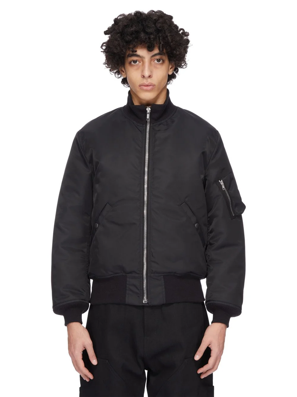 DRKSHDW FW25 CONCORDIANS TANKERS FLIGHT IN BLACK NYLON TWILL THIS TANKERS FLIGHT IS BELOW WAIST LENGTH WITH A CENTER FRONT ZIPPER CLOSURE, TWO SIDE WELT POCKETS WITH SNAPS (YKK MADE IN JAPAN) AND ONE SMALL SLEEVE UTILITY POCKET WITH ZIPPER ON THE LEFT ARM. FINISHED WITH A RIBBED FULL ZIP COLLAR, CUFFS AND WAISTBAND AN INTERNAL BLACK LEATHER PATCH (BELOW COLLAR) THIS MEDIUMWEIGHT NYLON TWILL HAS A STIFF AND TECHNICAL HANDFEEL. IT IS WOVEN IN JAPAN BY MASUDA CO LTD (EST. 1927) COLOR: BLACK MATERIAL: 100% NYLON MODEL IS 189CM TALL MODEL WEARS SIZE S