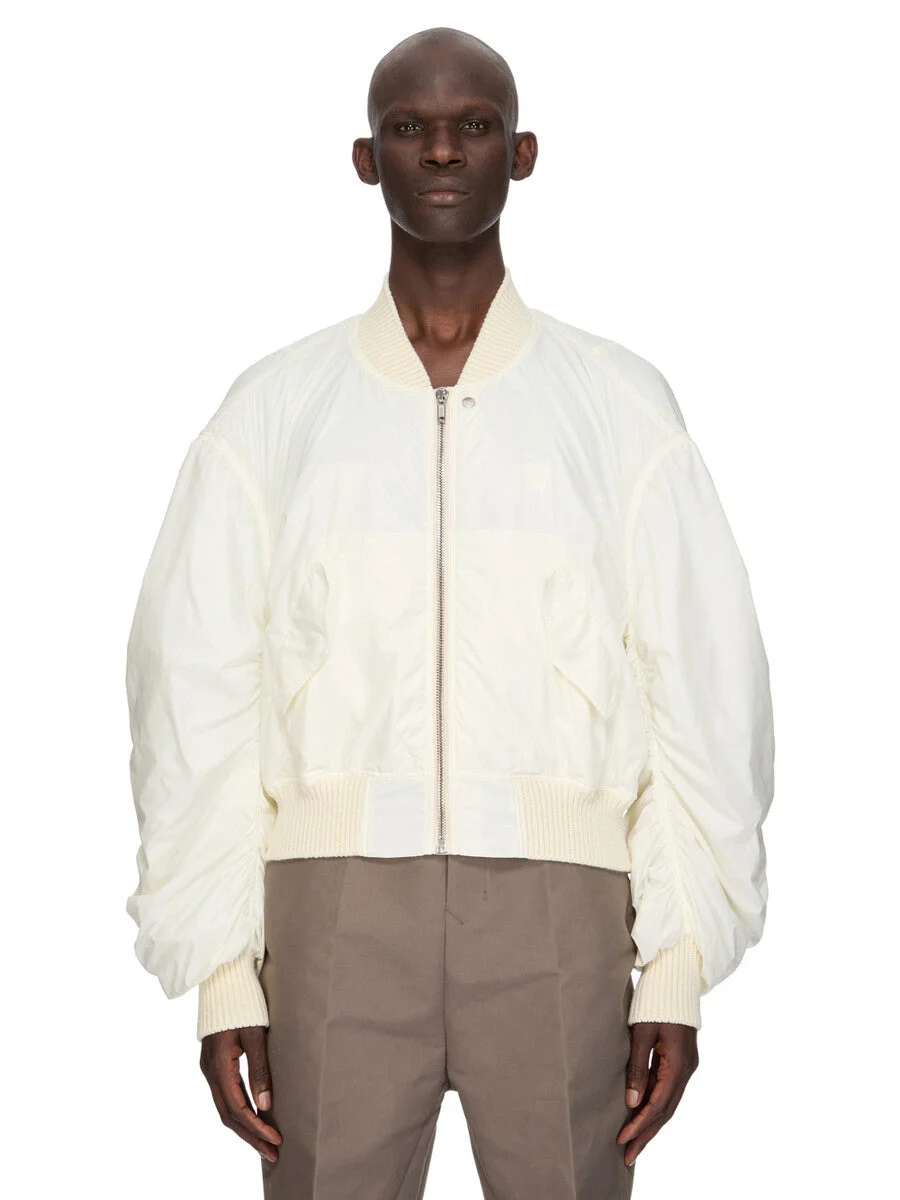 RICK OWENS SS26 TEMPLE SECCHIA FLIGHT IN MILK SHINY NYLON THIS SECCHIA FLIGHT IS OVERSIZED WITH LONG, GATHERED SLEEVES. IT HAS A RIBBED NECK, WRIST AND WAISTBAND FEATURES A CENTRE FRONT ZIPPER. IT HAS FRONT SIDE SNAP CLOSURE POCKETS WITH FLAPS. IT IS FULLY LINED AND HAS TWO INTERNAL ZIPPERED POCKETS. THIS AIRY AND LIGHTWEIGHT NYLON IS MADE USING GRS CERTIFIED RECYCLED NYLON WHICH ENSURES A REDUCTION IN WATER CONSUMPTION, EMISSIONS AND HAZARDOUS WASTE, LESSENING THE DEPENDENCE ON NON-RENEWABLE RESOURCES. COLOR: MILK MATERIAL:100% NYLON KNIT RIB COLLAR, WRIST BAND AND BOTTOM 92% NEW WOOL + + 6% NYLON + 2% ELASTANE PADDING 100% POLYESTER MODEL IS 189CM TALL MODEL WEARS SIZE 48